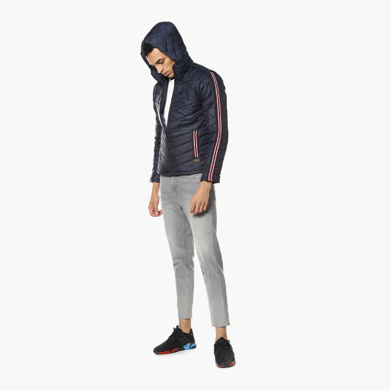 الأزرق الداكن الهندسي الذاتي تصميم سترة مبطنة ، لديه غطاء رأس ، جيوب 2 ، لديه إغلاق الرمز البريدي ، أكمام طويلة ، حاشية مستقيمة ، بطانة من البوليستر.