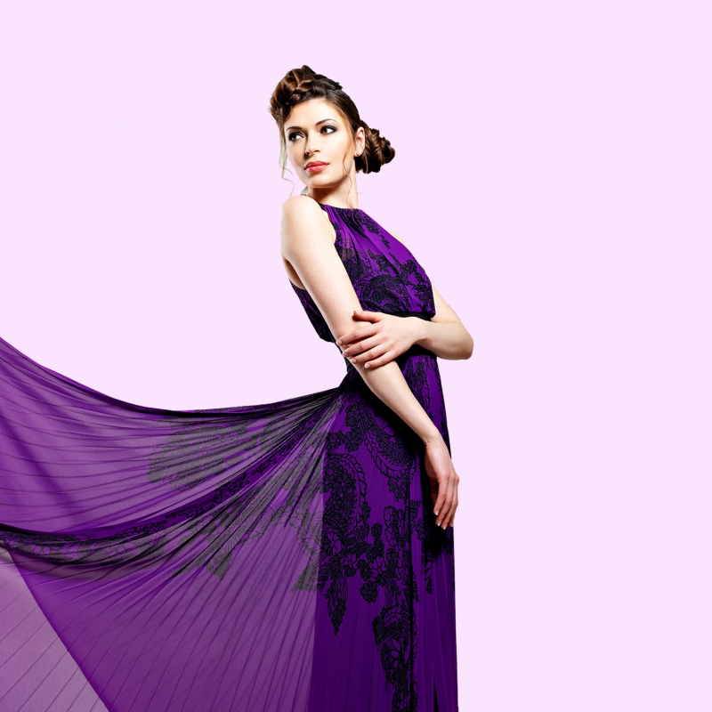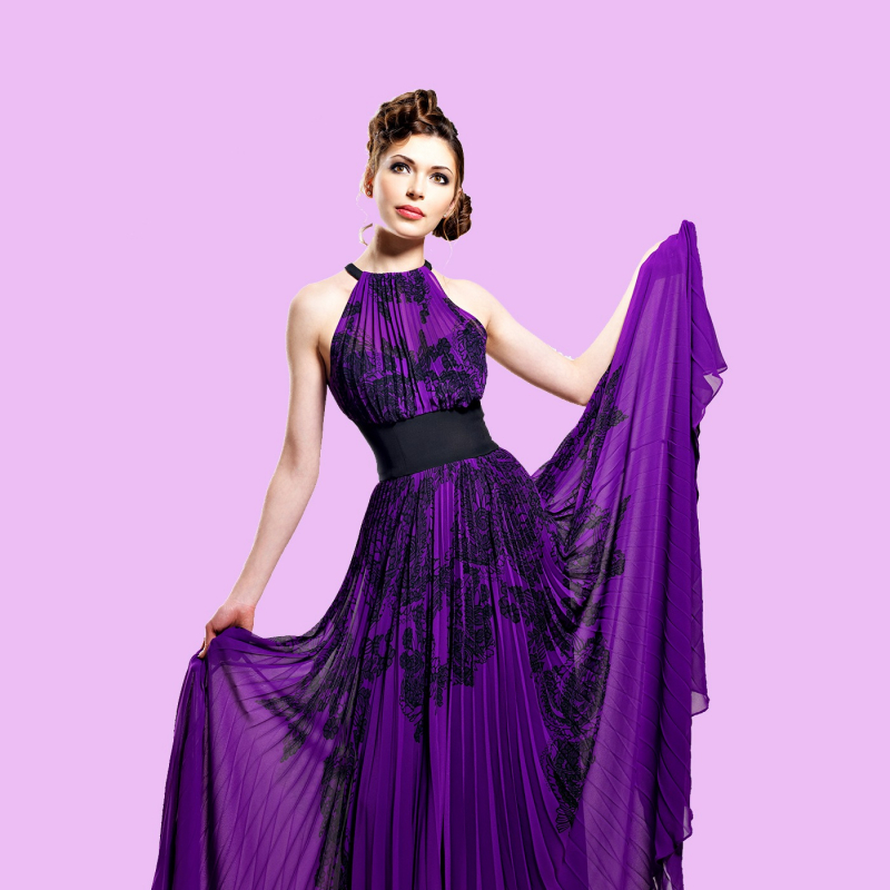 فستان ماكسي بنفسجي صلب، بياقة على شكل حرف V، وسحاب مخفي للإغلاق، وبطانة مرفقة، وحافة واسعة