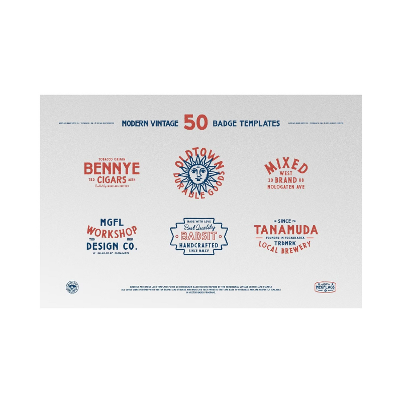 Badfest are badge logo templates with 50 handdrawn illustrations inspired by the traditional vintage graphic and stample. All logos were designed with vector shapes and strokes and have live text paths so they are easy to customize and are perfectly scalable in vector based programs.
