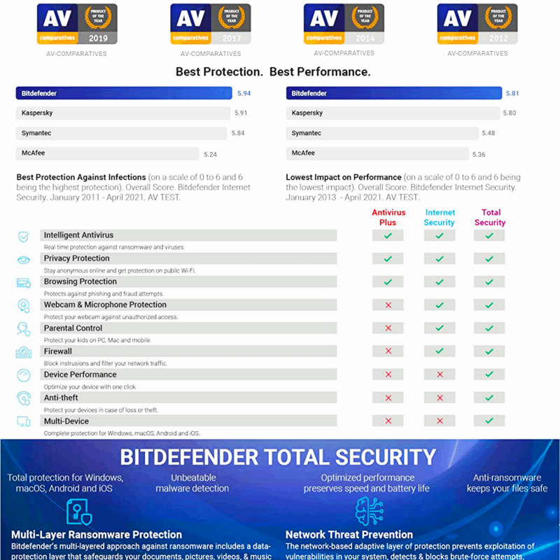 • Multi-Layer Ransomware Protection with Bitdefender Safe Files, Bitdefender VPN(200 MB free daily traffic), video & audio protection, Ransomware Remediation, Anti Tracker.