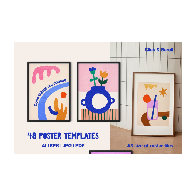 Cutout Vibes Collection includes 48 modern pre-made posters, 5 vector textures, and 392 elements for creating your unique design. You can resize and recolor all posters and elements in editable vector files.