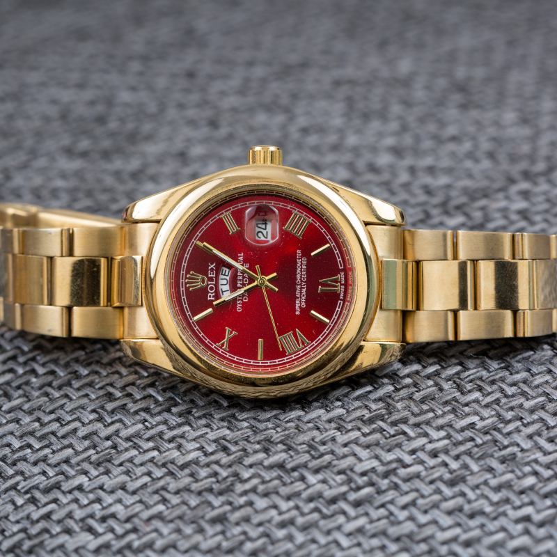 • This Oyster Perpetual DAY-DATE 40 in 18 CT yellow gold with a red dial, fluted bezel and a president bracelet.