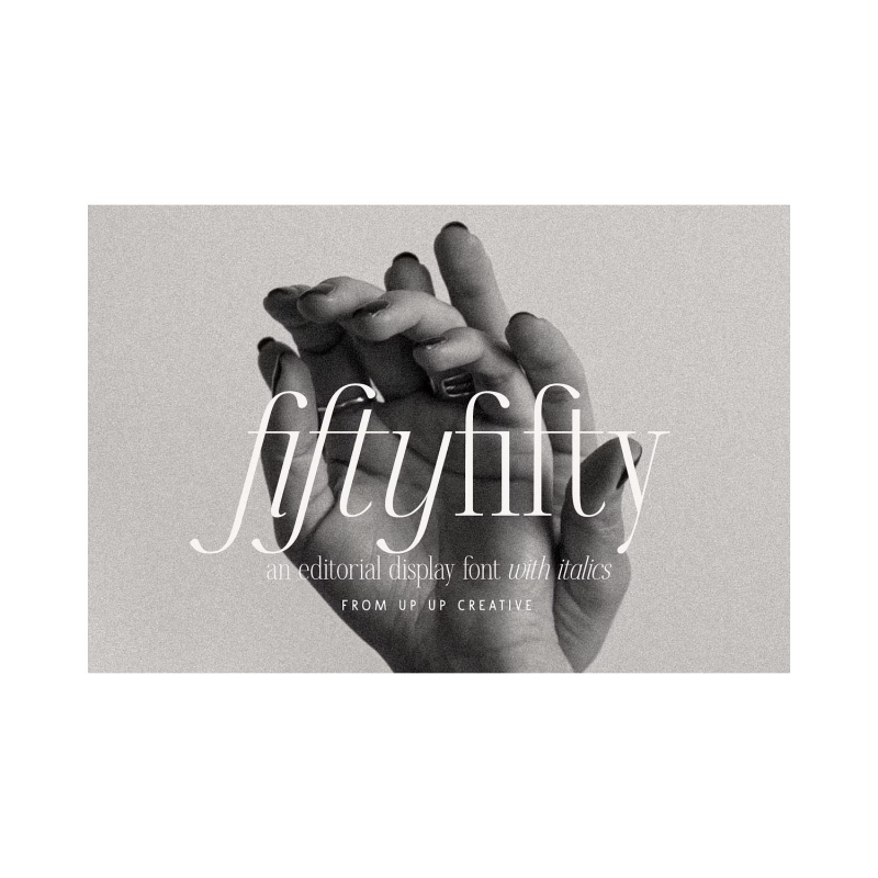 Fifty Fifty is an editorial serif font (regular and italic) with smooth curves and more than 100 ligatures. It’s gorgeous in all caps, but the lowercase letters can really hold their own. Fifty Fifty is perfect for headlines, editorial design, monograms, branding, logos, poster design, and more.