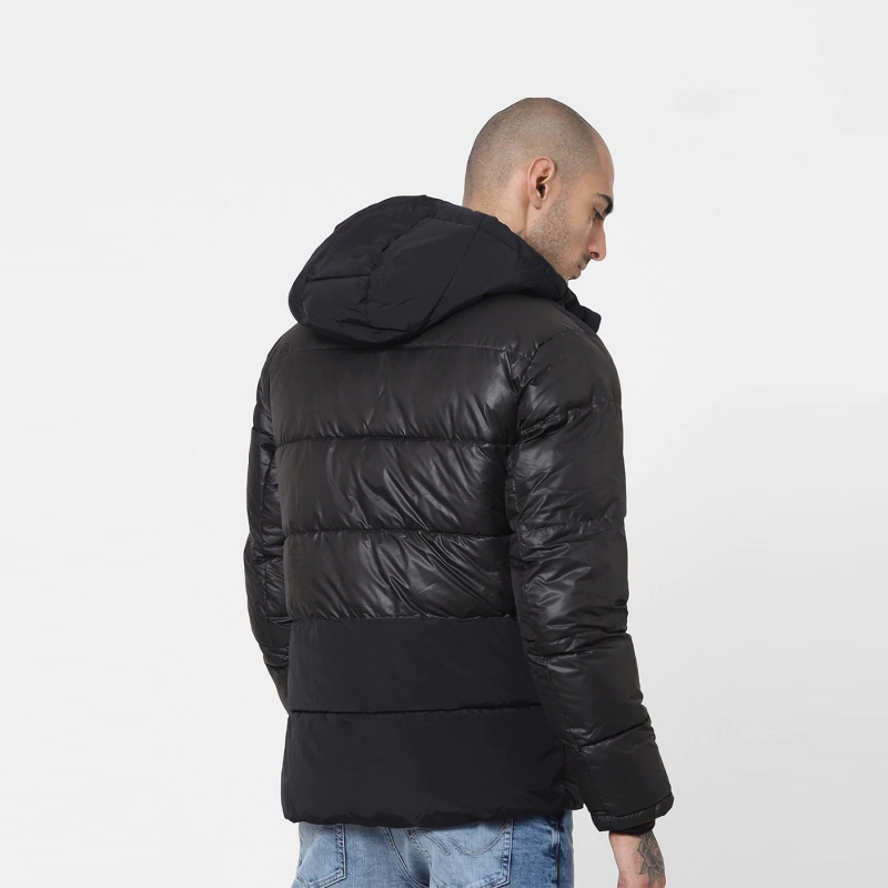 Black colour blocked padded jacket with zip detail, has a hooded, 2 pockets ,has a zip closure, long sleeves, straight hemline and polyester lining