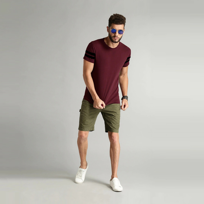 • Maroon solid T-shirt, has a round neck, short sleeves.