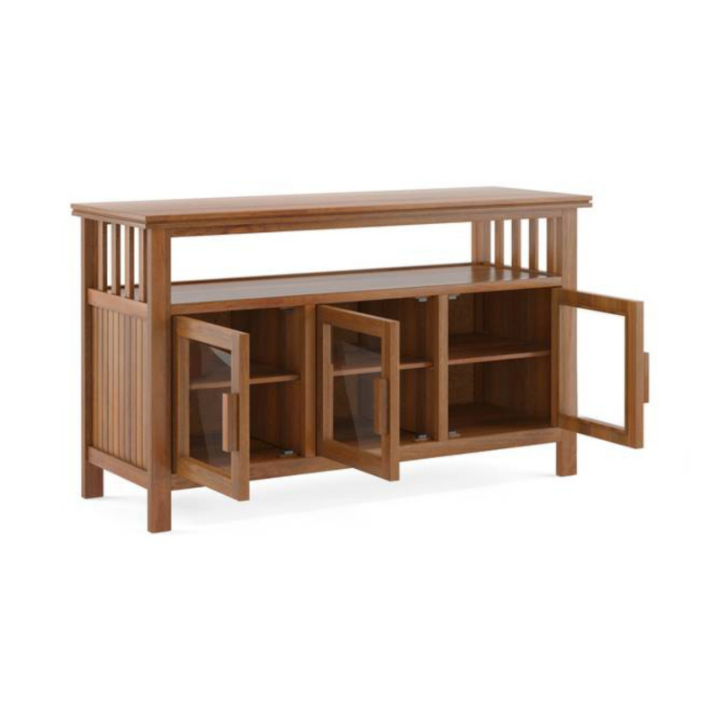 • Taking the high road.The Rhodes sideboard is the perfect mix of classic style and versatile storage. Be it in the dining room or hallway, this is at home anywhere. We love the textured side panels, which subtly elevate the design. The open shelf and tabletop have plenty of display space. Use the glass front cabinets to stow away crockery, appliances, and glassware.
