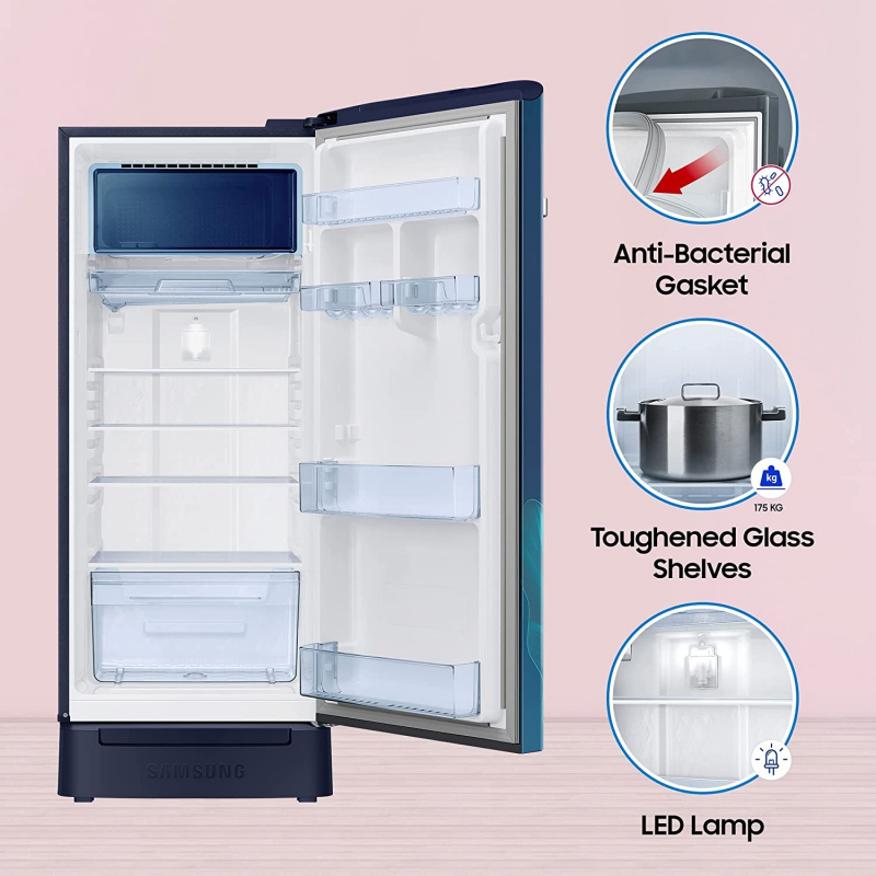 Interior Description : Fresh Food Capacity : 197L | Freezer Capacity : 18L | Total No Of Compartments : 1 | Drawers : 1 EA | Shelves : 3 EA | Shelf Type : Toughened Glass Shelves | Anti-Bacterial Gasket | Bottle Storage Capacity : 6 | Base Stand With Drawer For Additional Space For Non-Refrigerated Food Items