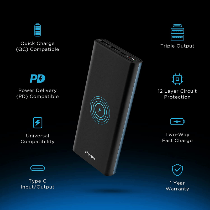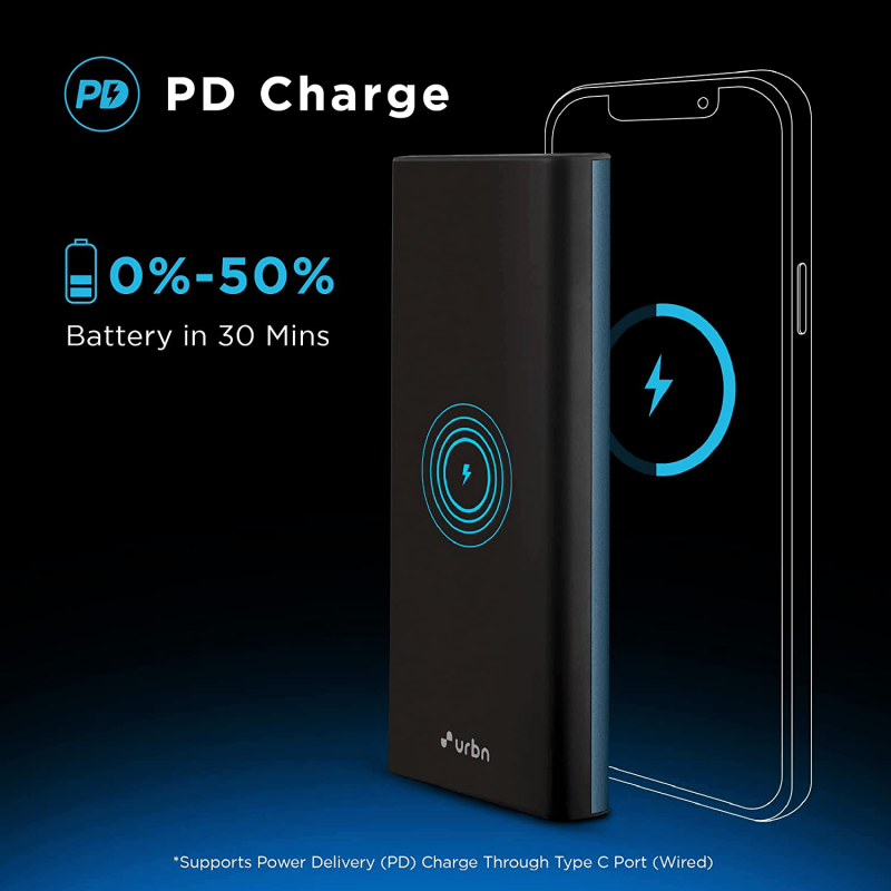 • 10000 mAh Wireless Power Bank with Super Fast 15W wireless charging and 22.5W wired charging charges your phone around 2 times in a flash with just one full charge.