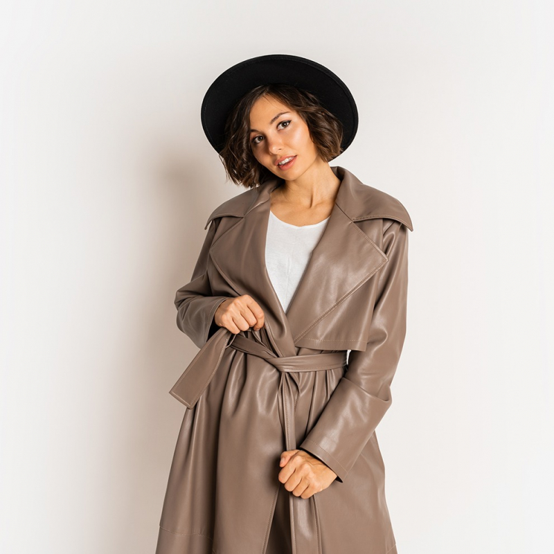 • Brown solid faux leather font-open longline trench coat, has notched lapel collar, long sleeves and single vented hem